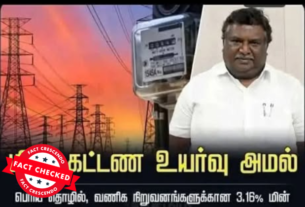 ‘‘பெரிய தொழில், வணிக நிறுவனங்களுக்கான மின் கட்டணம் உயர்வு,’’ என்று கூறி, சமூக வலைதளங்களில் பரவும் தகவல் பற்றி ஆய்வு மேற்கொண்டோம். தகவலின் விவரம்: இதனை வாசகர்கள் நமக்கு வாட்ஸ்ஆப் சாட்போட் (+919049053770) வழியே அனுப்பி, உண்மையா என்று சந்தேகம் கேட்டனர். இதில், ‘’ மின் கட்டண உயர்வு அமல். பெரிய தொழில், வணிக நிறுவனங்களுக்கான 3.16% மின் கட்டண உயர்வு இன்று முதல் அமல். 500 யூனிட் வரை பயன்படுத்தும் சிறு வணிகர்களுக்கு மின் கட்டண […]