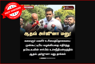 மகளிர் உரிமைத் தொகையை தமிழ்நாடு அரசு முன்கூட்டியே வழங்கியதை எதிர்த்து த.வெ.க சார்பில் உச்ச நீதிமன்றத்தில் ஆதவ் அர்ஜுனா மனு செய்துள்ளதாக புதிய தலைமுறை வெளியிட்டது போன்று நியூஸ் கார்டு ஃபேஸ்புக்கில் பதிவிடப்பட்டு வருகிறது. இது தொடர்பாக ஆய்வு செய்தோம். தகவலின் விவரம்: உண்மைப் பதிவைக் காண: Facebook I Archive ஆதவ் அர்ஜுனா புகைப்படத்துடன் புதிய தலைமுறை வெளியிட்டது போன்று நியூஸ் கார்டு ஃபேஸ்புக்கில் பதிவிடப்பட்டுள்ளது. அதில், “ஆதவ் அர்ஜுனா மனு! கலைஞர் மகளிர் உரிமத்தொகையை […]