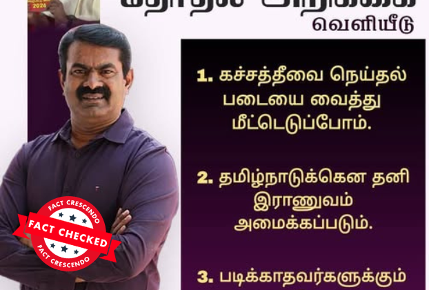 ‘‘தமிழ்நாட்டுக்கு தனி ராணுவம் அமைக்கப்படும்,’’ என்று சீமான் அறிவித்ததாகக் கூறி, சமூக வலைதளங்களில் பரவும் தகவல் பற்றி ஆய்வு மேற்கொண்டோம். தகவலின் விவரம்: இதனை வாசகர்கள் நமக்கு வாட்ஸ்ஆப் சாட்போட் (+919049053770) வழியே அனுப்பி, உண்மையா என்று சந்தேகம் கேட்டனர். இதில், ‘’ நாதக 2026 தேர்தல் அறிக்கை வெளியீடு. 1. கச்சத்தீவை நெய்தல் படையை வைத்து மீட்டெடுப்போம். 2. தமிழ்நாடுக்கென தனி இராணுவம் அமைக்கப்படும். 3. படிக்காதவர்களுக்கும் அரசு வேலை வழங்கப்படும்.- நாதக ஒருங்கிணைப்பாளர் சீமான்,’’ […]