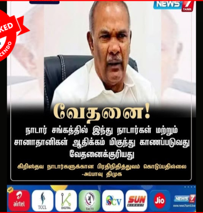 ‘‘நாடார் சங்கத்தில் கிறிஸ்தவர்களுக்கு பிரதிநிதித்துவம் இல்லை,’’ என்று திமுக மூத்த தலைவர் அப்பாவு கூறியதாக, சமூக வலைதளங்களில் பரவும் தகவல் பற்றி ஆய்வு மேற்கொண்டோம். தகவலின் விவரம்: இதனை வாசகர்கள் நமக்கு வாட்ஸ்ஆப் சாட்போட் (+919049053770) வழியே அனுப்பி, உண்மையா என்று சந்தேகம் கேட்டனர். இதில், ‘’ வேதனை! நாடார் சங்கத்தில் இந்து நாடார்கள் மற்றும் சானாதானிகள் ஆதிக்கம் மிகுந்து காணப்படுவது வேதனைக்குரியது. கிறிஸ்தவ நாடார்களுக்கான பிரதிநிதித்துவம் கொடுப்பதில்லை- அப்பாவு திமுக,’’ என்று எழுதப்பட்டுள்ளது. Claim Link […]