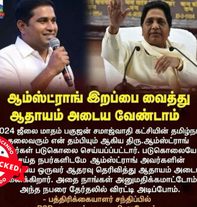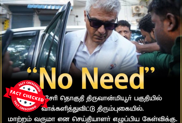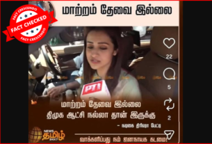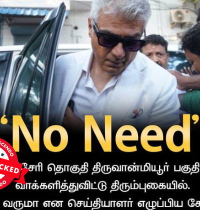 ‘‘ஆட்சி மாற்றம் No Need,’’ என்று அஜித் கூறியதாக, சமூக வலைதளங்களில் பரவும் தகவல் பற்றி ஆய்வு மேற்கொண்டோம். தகவலின் விவரம்: இதனை வாசகர்கள் நமக்கு வாட்ஸ்ஆப் சாட்போட் (+919049053770) வழியே அனுப்பி, உண்மையா என்று சந்தேகம் கேட்டனர். இதில், ‘’ சீ No Need. வேளச்சேரி தொகுதி திருவான்மியூர் பகுதியில் வாக்களித்துவிட்டு திரும்புகையில். மாற்றம் வருமா என செய்தியாளர் எழுப்பிய கேள்விக்கு. மாற்றம் தேவையில்லை. (No Need) என பதிலளித்தார் நடிகர் அஜித் குமார்.,’’ என்று […]