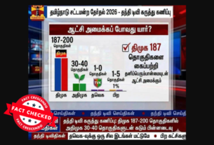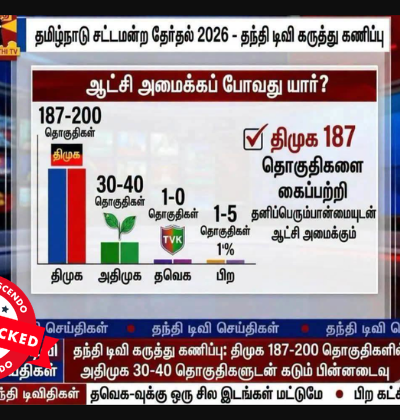 கொளத்தூர் தொகுதியில் தவெக வேட்பாளரிடம் மு.க.ஸ்டாலின் தோல்வியைத் தழுவுவார் என்று தந்தி டிவி கருத்துக் கணிப்பு வெளியிட்டதாக பலரும் சமூக ஊடகங்களில் பதிவிட்டு வருகின்றனர். இது தொடர்பாக ஆய்வு செய்தோம். தகவலின் விவரம்: உண்மைப் பதிவைக் காண: Facebook I Archive தந்தி டிவி வெளியிட்டது போன்று கருத்துக் கணிப்பு செய்தியை ஸ்கிரீன்ஷாட் எடுத்து அதை வைத்து புகைப்பட பதிவை உருவாக்கி ஃபேஸ்புக்கில் பதிவிட்டுள்ளனர். அதில் “கொளத்தூர் தொகுதியில் தவெக 41-47 சதவிகித வாக்கும், தி.மு.க 28 […]