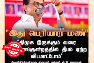 ‘‘திமுக இருக்கும் வரை திருப்பரங்குன்றத்தில் தீபம் ஏற்ற விடமாட்டோம்,’’ என்று மு.க.ஸ்டாலின் கூறியதாக, சமூக வலைதளங்களில் பரவும் தகவல் பற்றி ஆய்வு மேற்கொண்டோம். தகவலின் விவரம்: இதனை வாசகர்கள் நமக்கு வாட்ஸ்ஆப் சாட்போட் (+919049053770) வழியே அனுப்பி, உண்மையா என்று சந்தேகம் கேட்டனர். இதில், ‘’ இது பெரியார் மண். ‘திமுக இருக்கும் வரை திருப்பரங்குன்றத்தில் தீபம் ஏற்ற விடமாட்டோம்’ வேண்டும்மென்றால் தினமும் உங்கள் வீட்டு சமையல் அறையிலோ? பூஜை அறையிலோ தீபத்தை ஏற்றுங்கள் என தேர்தல் […]