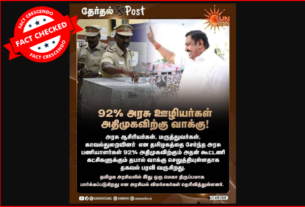 92 சதவிகித அரசு ஊழியர்கள் அதிமுக-வுக்கு வாக்களித்ததாக சன் நியூஸ் மற்றும் பாலிமர் டிவி வெளியிட்டது போன்று நியூஸ் கார்டுகள் சமூக ஊடகங்களில் வைரலாக பகிரப்பட்டு வருகின்றன. இது தொடர்பாக ஆய்வு செய்தோம். தகவலின் விவரம்: உண்மைப் பதிவைக் காண: Facebook I Archive சன் நியூஸ் வெளியிட்டது போன்று நியூஸ் கார்டு ஃபேஸ்புக்கில் பதிவிடப்பட்டுள்ளது. அதில், “92% அரசு ஊழியர்கள் அதிமுகவிற்கு வாக்கு! அரசு ஆசிரியர்கள், மருத்துவர்கள், காவல்துறையினர் என தமிழகத்தைச் சேர்ந்த அரசு பணியாளர்கள் […]