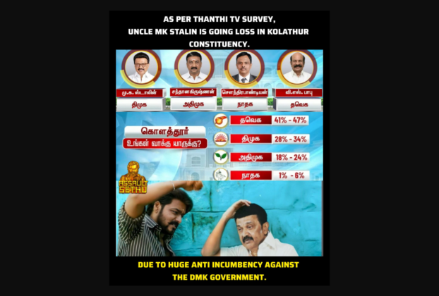 கொளத்தூரில் ஸ்டாலின் தோல்வி அடைவார் என்று தந்தி டிவி கருத்துக்கணிப்பு வெளியிட்டதா?