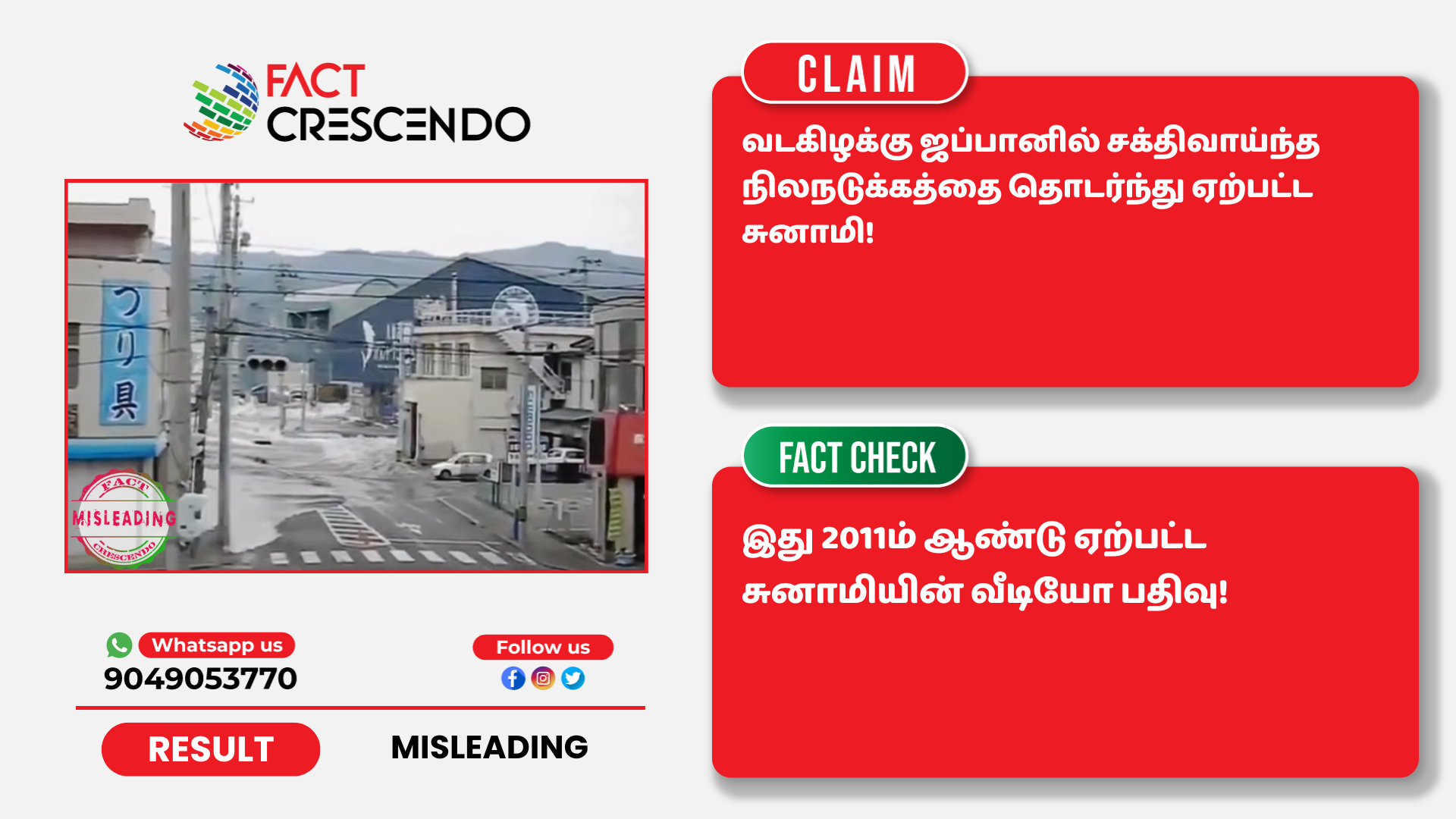 இது 2011ம் ஆண்டு ஜப்பானில் ஏற்பட்ட சுனாமியின் வீடியோ பதிவை தற்போது ஏற்பட்டது போன்று தவறாக சமூக ஊடகங்களில் பகிர்ந்திருப்பதை தகுந்த ஆதாரங்கள் அடிப்படையில் ஃபேக்ட் கிரஸண்டோ தமிழ் உறுதி செய்துள்ளது. எனவே, இத்தகைய தவறான செய்தி, புகைப்படங்கள், வீடியோ போன்றவற்றை உறுதி செய்யாமல் மற்றவர்களுக்குப் பகிர வேண்டாம் என கேட்டுக் கொள்கிறோம். வாசகர்கள் தங்களுக்கு சந்தேகம் என்று தோன்றும் தகவல், பதிவு, புகைப்படம், வீடியோவை எங்களது வாட்ஸ் ஆப் எண்ணிற்கு (+91 9049053770) அனுப்பினால், அதுபற்றி ஆய்வு செய்து உண்மை விவரத்தை வெளியிடுகிறோம்.