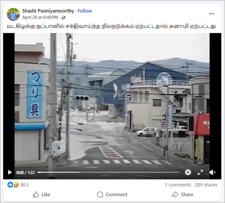 சாலையில் வெள்ள நீர் வருவது போன்று வீடியோ ஃபேஸ்புக்கில் பதிவிடப்பட்டுள்ளது. நிலைத் தகவலில். “வடகிழக்கு ஜப்பானில் சக்திவாய்ந்த நிலநடுக்கம் ஏற்பட்டதால் சுனாமி ஏற்பட்டது” என்று குறிப்பிடப்பட்டிருந்தது. இந்த வீடியோவை பலரும் சமூக ஊடகங்களில் பகிர்ந்து வருகின்றனர்.