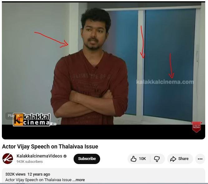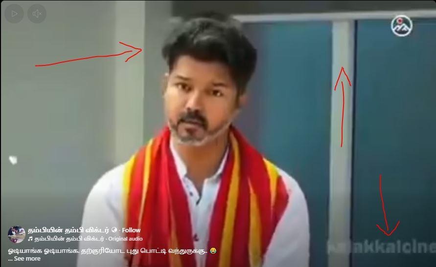 மேற்கண்ட தகவல் உண்மையா என்று நாம் ஆய்வு மேற்கொண்டோம். இதில் வரும் Kalakkal Cinema என்ற லோகோ மற்றும் விஜய் கழுத்தில் உள்ள தவெக., துண்டு, பின்னணியில் உள்ள கண்ணாடி ஜன்னல் போன்றவற்றை வைத்து, தகவல் தேடினோம். அப்போது, இது எடிட் செய்து, பகிரப்படும் வதந்தி, என்று தெரியவந்தது.