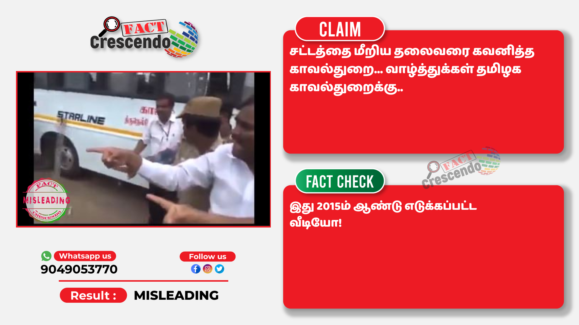 உரிய ஆதாரங்களின் அடிப்படையில் மேற்கண்ட தகவல் நம்பகமானது இல்லை என்று ஃபேக்ட் கிரஸண்டோ தமிழ் நிரூபித்துள்ளது. நமது வாசகர்கள் இத்தகைய தவறான செய்தி, புகைப்படம் மற்றும் வீடியோவை கண்டால், எங்களது வாட்ஸ் ஆப் எண்ணிற்கு (+91 9049053770) அனுப்புங்கள். நாங்கள், அதுபற்றி ஆய்வு செய்து உண்மை விவரத்தை வெளியிடுகிறோம்.