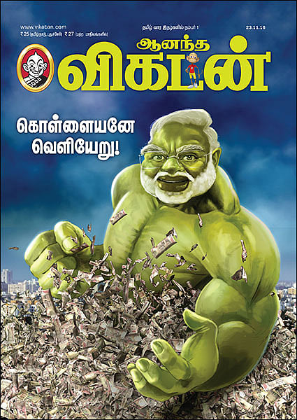 அதேசமயம், கடந்த 2016ம் ஆண்டு நவம்பர் மாதத்தில் மோடி தலைமையிலான மத்திய அரசு பண மதிப்பிழப்பு அறிவிப்பை வெளியிட்டது. இதன்படி, 500, 1000 ரூபாய் நோட்டுகள் செல்லாது என்று தெரிவிக்கப்பட்டது. இந்த நடவடிக்கையை பாராட்டி அப்போது விகடன் மேற்கண்ட வகையில் அட்டைப்படம் ஒன்றை வெளியிட்டது.