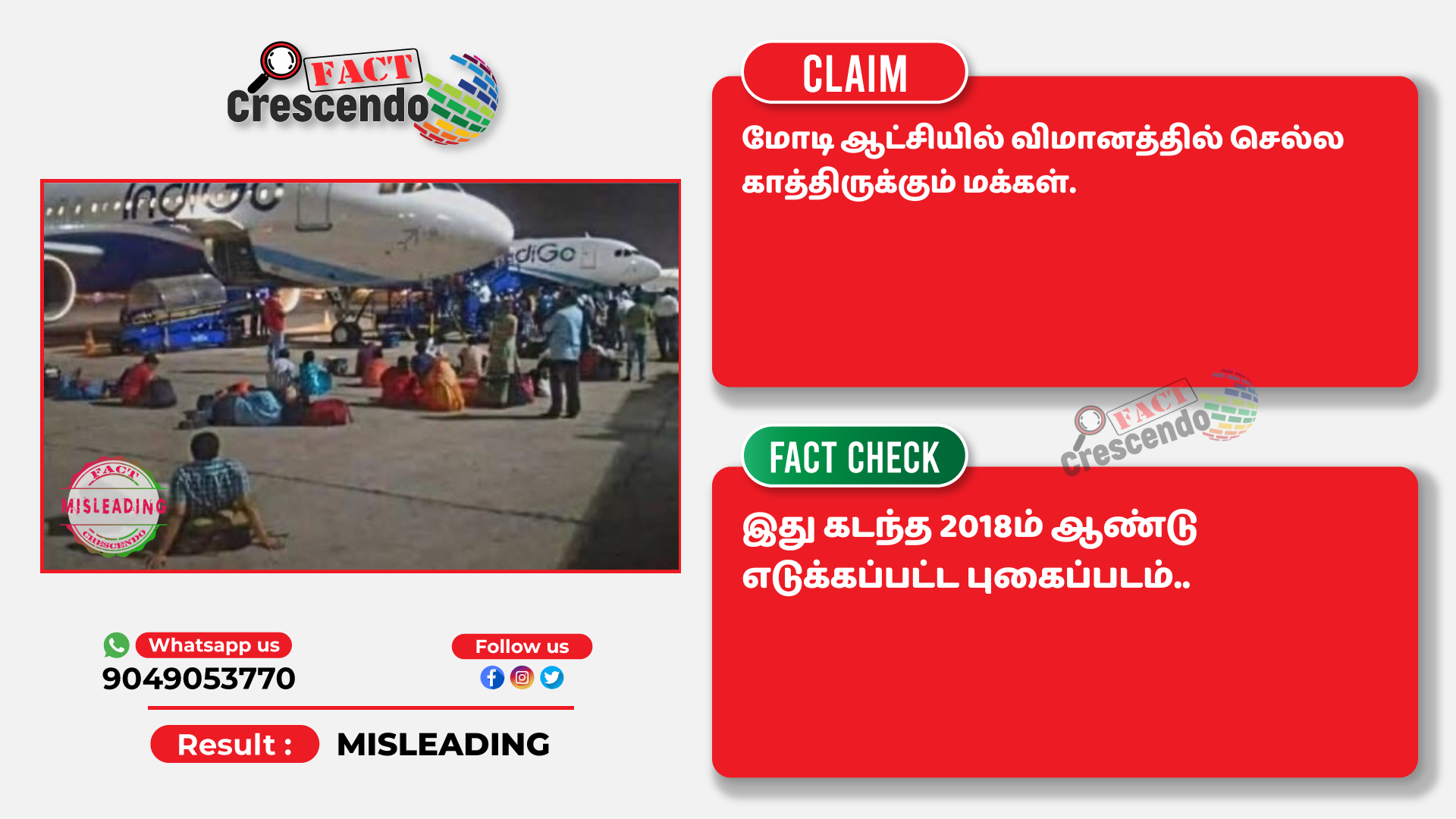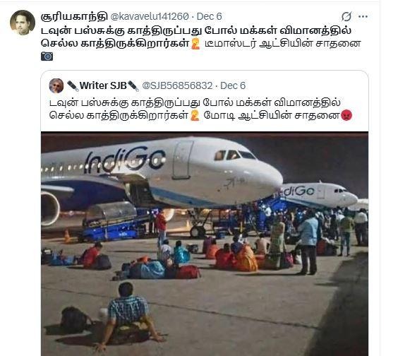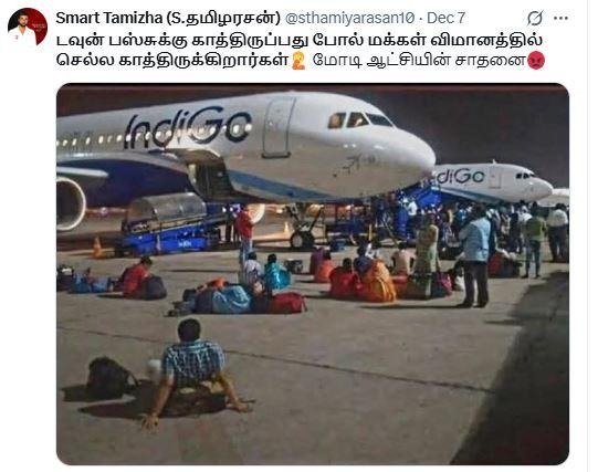 இதில், ‘’ டவுன் பஸ்சுக்கு காத்திருப்பது போல் மக்கள் விமானத்தில் செல்ல காத்திருக்கிறார்கள்🤦 மோடி ஆட்சியின் சாதனை😡,’’ என்று எழுதப்பட்டுள்ளது.