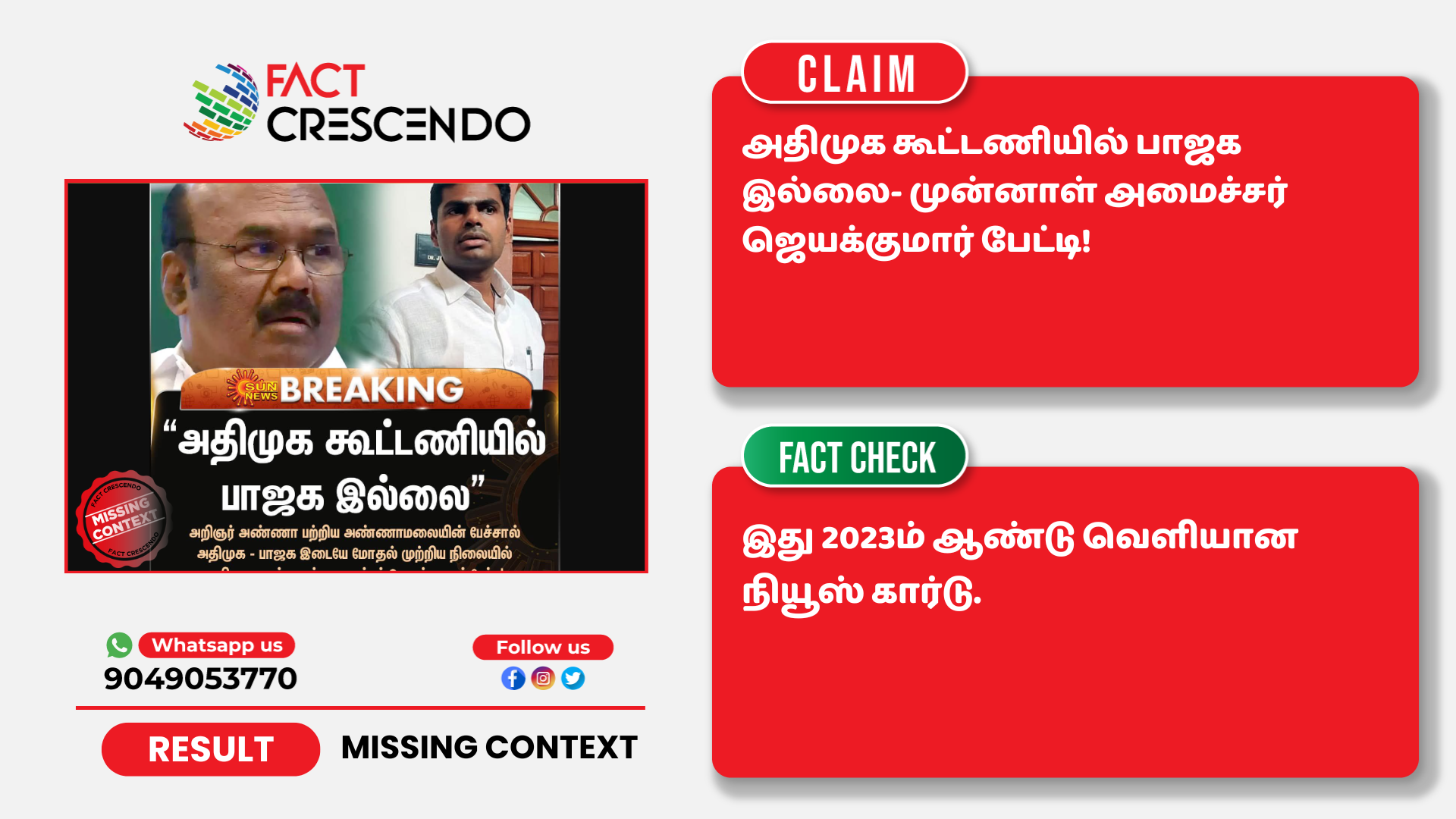 அதிமுக கூட்டணியில் பாஜக இல்லை என்று 2023ம் ஆண்டு அதிமுக முன்னாள் அமைச்சர் ஜெயக்குமார் அளித்த பேட்டியை 2026 பிப்ரவரியில் சமூக ஊடகங்களில் தவறான புரிதல் ஏற்படுத்தும் வகையில் பதிவிட்டு வருவதை தகுந்த ஆதாரங்கள் அடிப்படையில் ஃபேக்ட் கிரஸண்டோ தமிழ் உறுதி செய்துள்ளது. எனவே, இத்தகைய தவறான செய்தி, புகைப்படங்கள், வீடியோ போன்றவற்றை உறுதி செய்யாமல் மற்றவர்களுக்குப் பகிர வேண்டாம் என கேட்டுக் கொள்கிறோம். வாசகர்கள் தங்களுக்கு சந்தேகம் என்று தோன்றும் தகவல், பதிவு, புகைப்படம், வீடியோவை எங்களது வாட்ஸ் ஆப் எண்ணிற்கு (+91 9049053770) அனுப்பினால், அதுபற்றி ஆய்வு செய்து உண்மை விவரத்தை வெளியிடுகிறோம்.