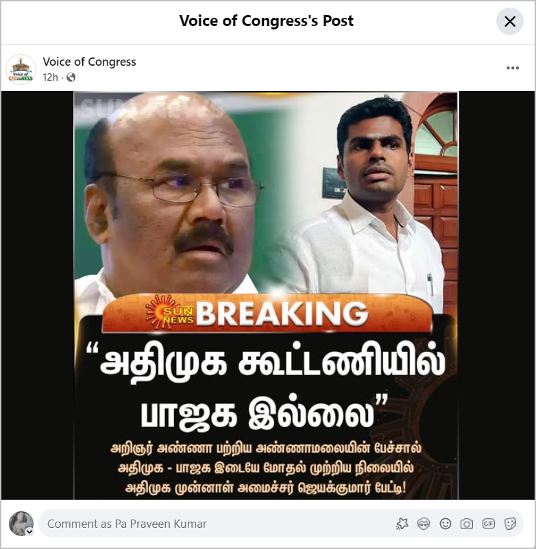 சன் நியூஸ் வெளியிட்ட நியூஸ் கார்டு ஃபேஸ்புக்கில் பதிவிடப்பட்டுள்ளது. அதில், “அதிமுக கூட்டணியில் பாஜக இல்லை. அறிஞர் அண்ணா பற்றிய அண்ணாமலையின் பேச்சால் அதிமுக – பாஜக இடையே மோதல் முற்றிய நிலையில் அதிமுக முன்னாள் அமைச்சர் ஜெயக்குமார் பேட்டி” என்று குறிப்பிடப்பட்டிருந்தது. இந்த நியூஸ் கார்டை பலரும் சமூக ஊடகங்களில் பதிவிட்டு வருகின்றனர்.