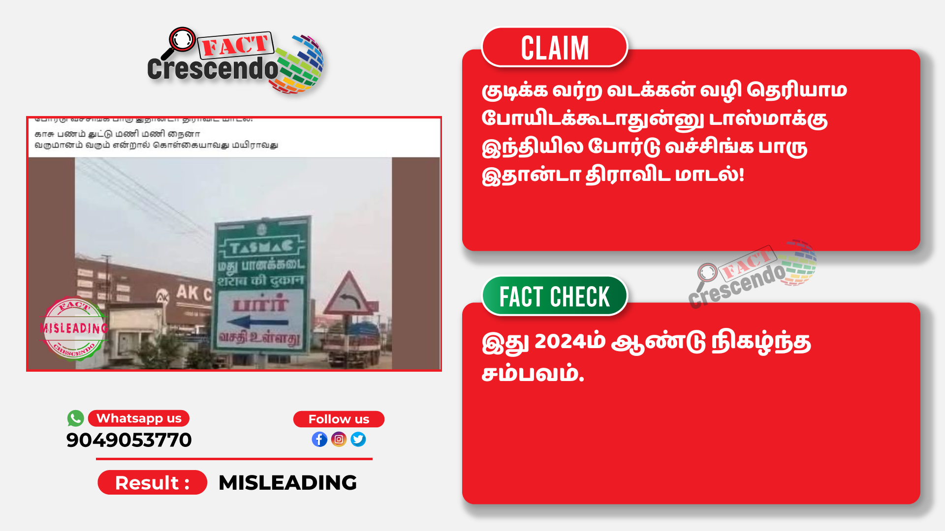 ‘‘டாஸ்மாக் வரும் வடக்கன்களுக்கு, வழி காட்ட இந்தியில் போர்டு வைத்துள்ள திராவிட மாடல்’’ என்று கூறி, சமூக வலைதளங்களில் பரவும் தகவல் பற்றி ஆய்வு மேற்கொண்டோம்.