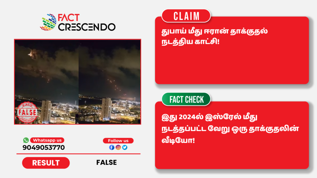 2024ம் ஆண்டு இஸ்ரேல் தலைநகர் டெல் அவிவ் மீது நடத்தப்பட்ட தாக்குதலின் வீடியோவை இப்போது துபாய் மீது இஸ்ரேல் நடத்திய தாக்குதல் என்று தவறான தகவல் சேர்த்து சமூக ஊடகங்களில் பகிர்ந்திருப்பதை தகுந்த ஆதாரங்கள் அடிப்படையில் ஃபேக்ட் கிரஸண்டோ தமிழ் உறுதி செய்துள்ளது. எனவே, இத்தகைய தவறான செய்தி, புகைப்படங்கள், வீடியோ போன்றவற்றை உறுதி செய்யாமல் மற்றவர்களுக்குப் பகிர வேண்டாம் என கேட்டுக் கொள்கிறோம். வாசகர்கள் தங்களுக்கு சந்தேகம் என்று தோன்றும் தகவல், பதிவு, புகைப்படம், வீடியோவை எங்களது வாட்ஸ் ஆப் எண்ணிற்கு (+91 9049053770) அனுப்பினால், அதுபற்றி ஆய்வு செய்து உண்மை விவரத்தை வெளியிடுகிறோம்.