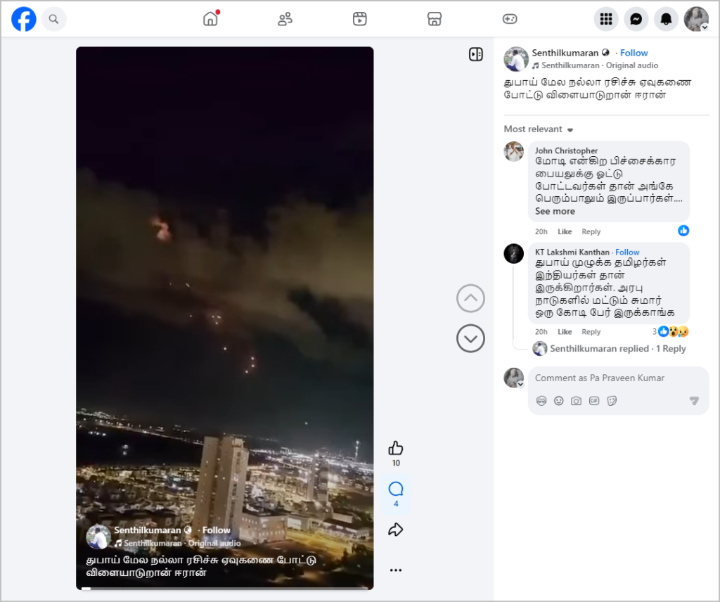 ஏவுகணை அல்லது டிரோன் தாக்குதல் நடப்பது போன்று வீடியோ ஃபேஸ்புக்கில் பதிவிடப்பட்டுள்ளது. நிலைத் தகவலில், “துபாய் மேல நல்லா ரசிச்சு ஏவுகணை போட்டு விளையாடுறான் ஈரான்” என்று குறிப்பிடப்பட்டிருந்தது. இந்த வீடியோவை பலரும் சமூக ஊடகங்களில் பதிவிட்டு வருகின்றனர்.