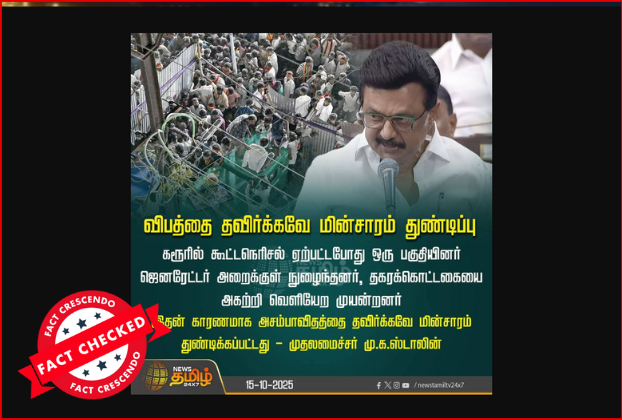 கரூர் தவெக பிரசார கூட்டத்தில் விபத்தைத் தவிர்க்கவே மின்சாரம் துண்டிக்கப்பட்டது என்று தமிழ்நாடு முதலமைச்சர் மு.க.ஸ்டாலின் கூறியதாக ஒரு பதிவு சமூக ஊடகங்களில் வைரலாக பகிரப்பட்டு வருகிறது. இது தொடர்பாக ஆய்வு செய்தோம். தகவலின் விவரம்: உண்மைப் பதிவைக் காண: Facebook I Archive இரண்டு நியூஸ்கார்டுகளை வைத்து ஃபேஸ்புக்கில் பதிவிடப்பட்டுள்ளது. முதல் நியூஸ் கார்டில், “மின்சாரம் துண்டிக்கப்படவில்லை” என்று செந்தில் பாலாஜி கூறியது குறிப்பிடப்பட்டிருந்தது. இரண்டாவது நியூஸ் கார்டில், “விபத்தை தவிர்க்கவே மின்சாரம் துண்டிப்பு. கரூரில் […]
