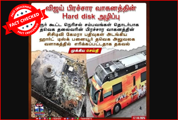 விஜய் பிரசார வாகனத்தின் Hard disk அழிப்பு என்று பரவும் நியூஸ் கார்டு உண்மையா?