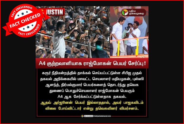 A4 குற்றவாளியாக ராஜ் மோகன் பெயர் சேர்ப்பு என்று புதிய தலைமுறை தொலைக்காட்சி வெளியிட்டது போன்று நியூஸ் கார்டு ஒன்று சமூக ஊடகங்களில் பகிரப்பட்டு வருகிறது. இது தொடர்பாக ஆய்வு செய்தோம். தகவலின் விவரம்: உண்மைப் பதிவைக் காண: Facebook I Archive புதிய தலைமுறை வெளியிட்டது போன்று நியூஸ்கார்டு ஃபேஸ்புக்கில் பதிவிடப்பட்டுள்ளது. அதில், “A4 குற்றவாளியாக ராஜ்மோகன் பெயர் சேர்ப்பு! கரூர் நீதிமன்றத்தில் தாக்கல் செய்யப்பட்டுள்ள சிபிஐ முதல் தகவல் அறிக்கையில் மாவட்ட செயலாளர் மதியழகன், […]