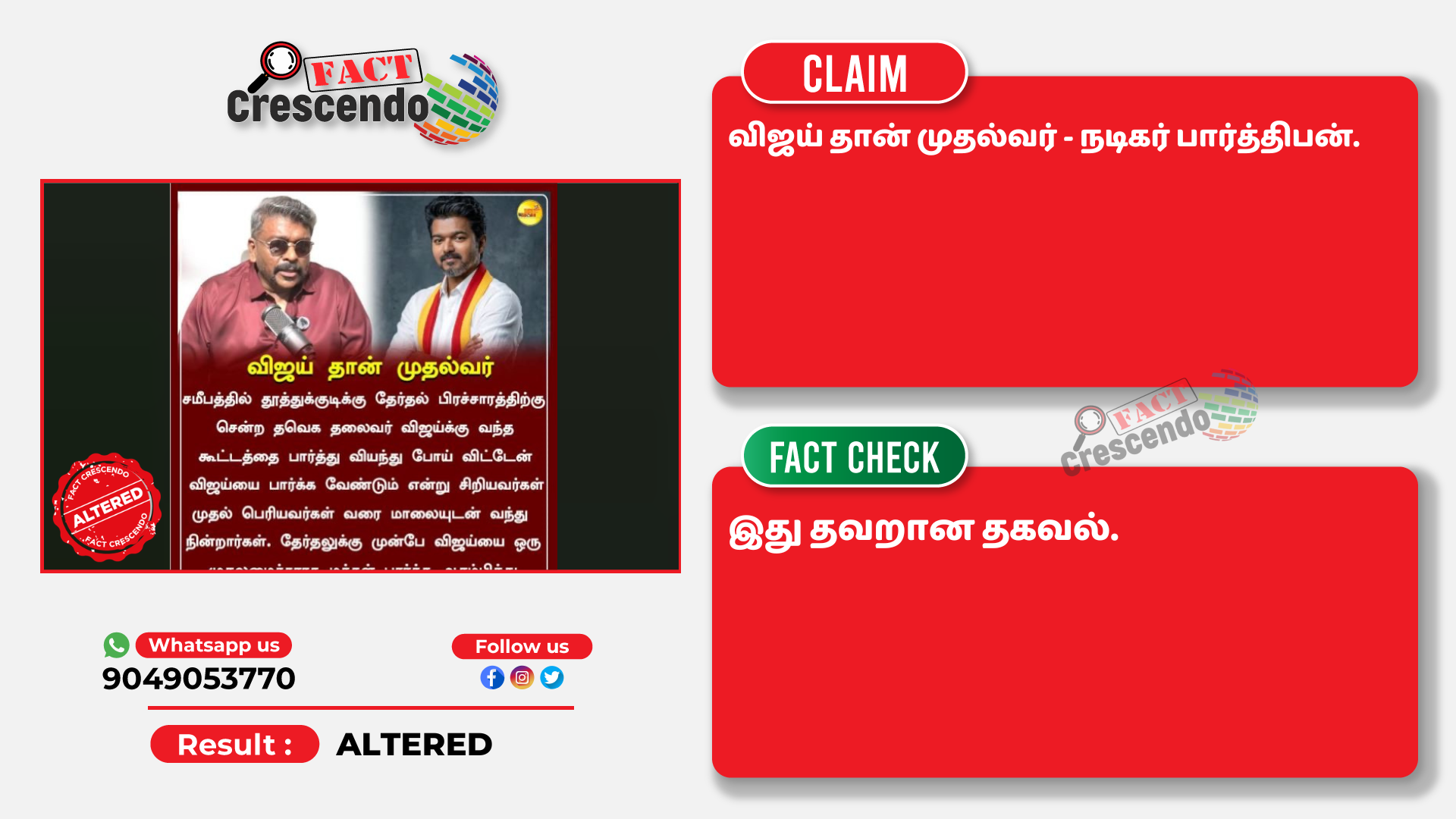 ‘‘விஜய்தான் முதல்வர்,’’ என்று நடிகர் பார்த்திபன் கூறியதாக, சமூக வலைதளங்களில் பரவும் தகவல் பற்றி ஆய்வு மேற்கொண்டோம்.