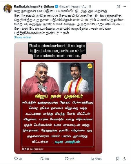 இதன்படி, justbefilmy என்ற ஊடகம் போதிய ஆதாரம் இன்றி மேற்கண்ட செய்தியை வெளியிட்டுள்ளது. பின்னர் பார்த்திபன் இதுபற்றி விளக்கம் கேட்ட நிலையில் அந்த செய்தியை justbefilmy ஊடகம், சமூக வலைதளத்தில் இருந்து, அகற்றியுள்ளது.