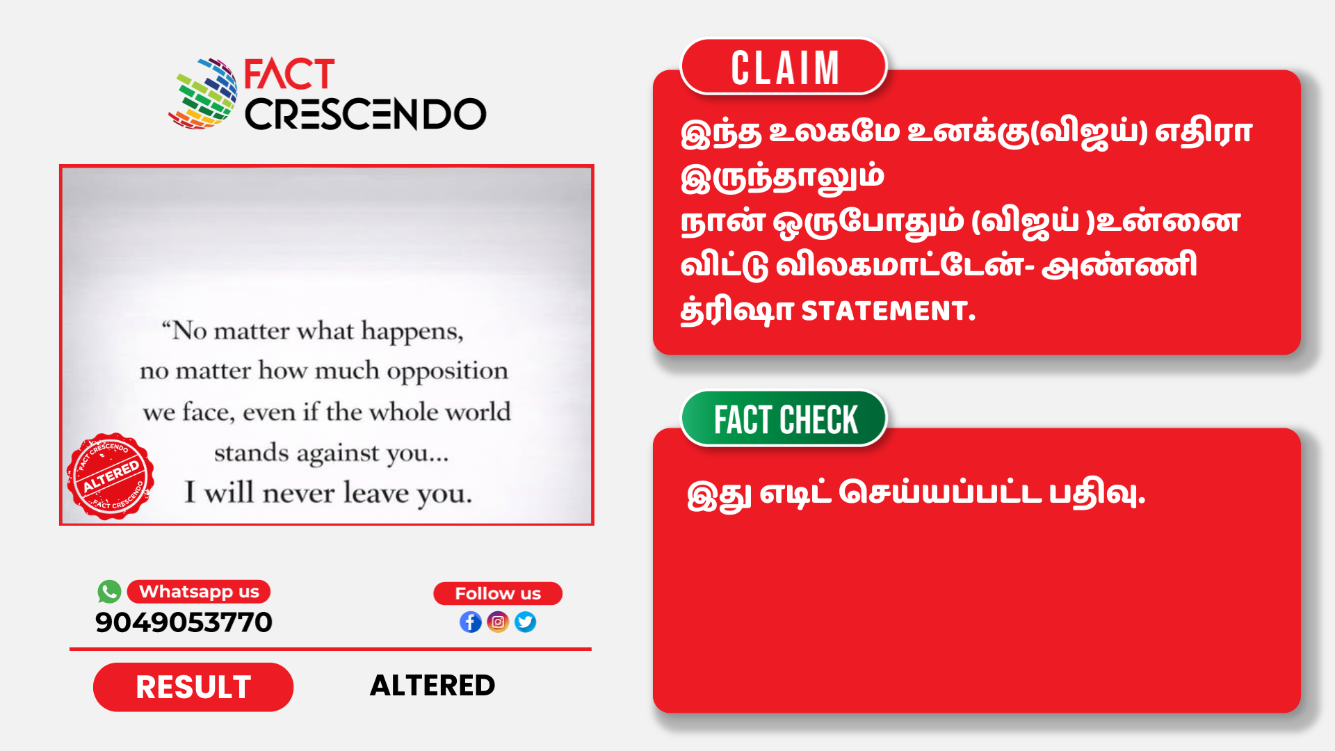 மேற்கண்ட தகவல் உண்மையா என்று நாம் ஆய்வு மேற்கொண்டோம். அப்போது, இதுபோன்ற எந்த பதிவும் சமீபத்தில் நடிகை திரிஷா வெளியிடவில்லை, என்று தெரியவந்தது. இதில் உள்ள எழுத்துகள், ஃபாண்ட் போன்றவை எடிட் செய்யப்பட்டது போன்று உள்ளது.
