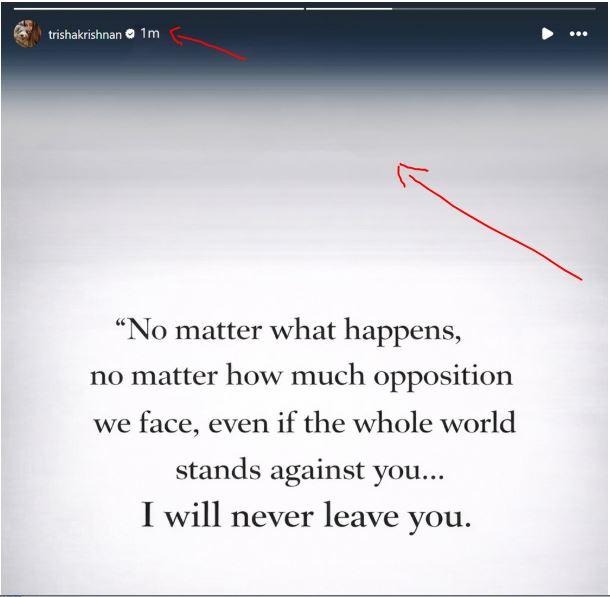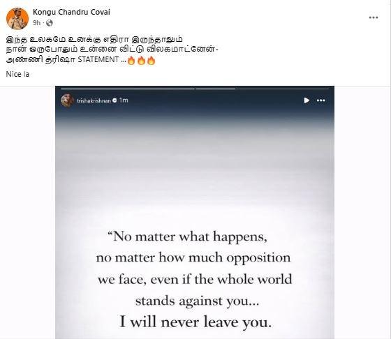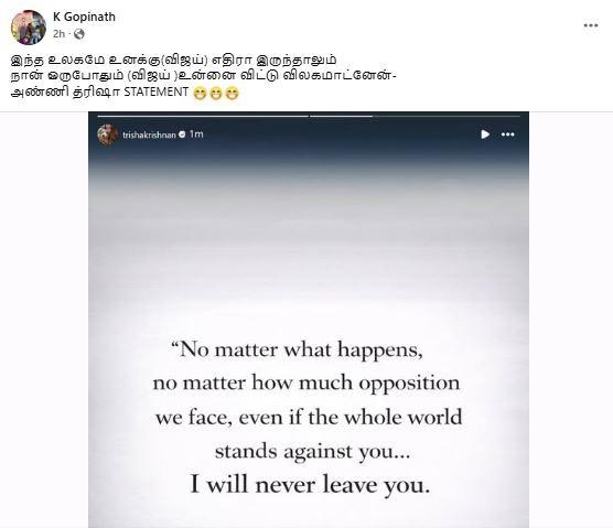 இதில், ‘’ இந்த உலகமே உனக்கு எதிரா இருந்தாலும் நான் ஒருபோதும் உன்னை விட்டு விலகமாட்னேன்- அண்ணி த்ரிஷா STATEMENT …🔥🔥🔥