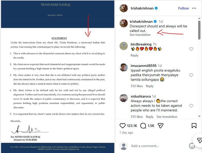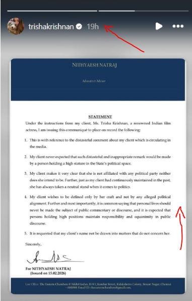 இத்தகைய சூழலில், நடிகை திரிஷா சார்பாக, அவரது வழக்கறிஞர் கண்டன அறிக்கை வெளியிட்டுள்ளார். இந்த அறிக்கையை திரிஷா, இன்ஸ்டாகிராம் பக்கத்தில் பதிவு செய்திருந்தார்.