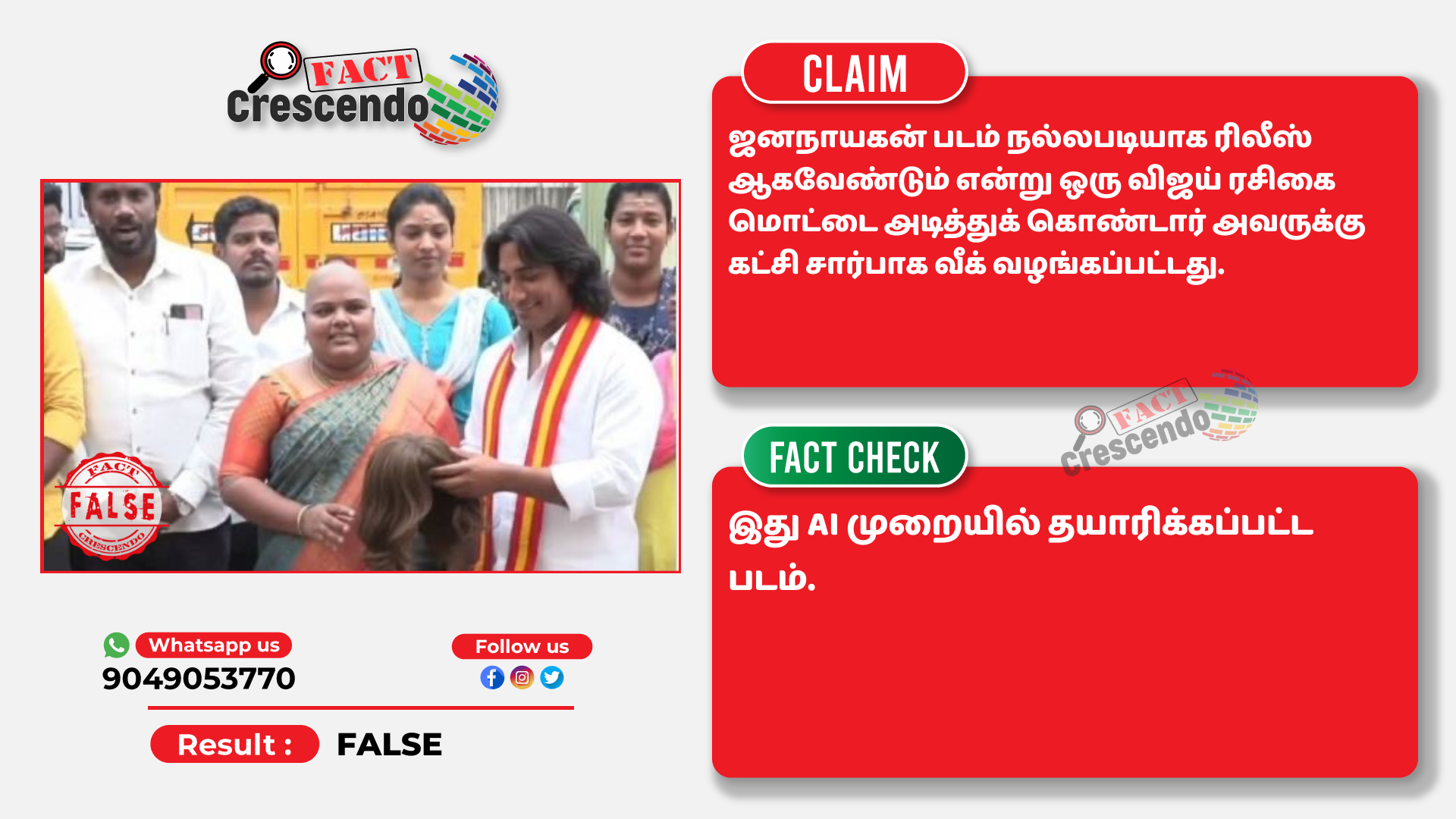 இதன்படி, சென்னையில் ஜனநாயகன் திரைப்படத்திற்கு நல்ல தீர்ப்பு வர வேண்டும், என்று பெண் ரசிகை ஒருவர், குல தெய்வ கோவிலில் முடியை காணிக்கை செலுத்தினார். அதுபற்றிய புகைப்படம் ஒன்றை எடுத்து, AI உதவியுடன் எடிட் செய்து, பரப்புகிறார்கள்.