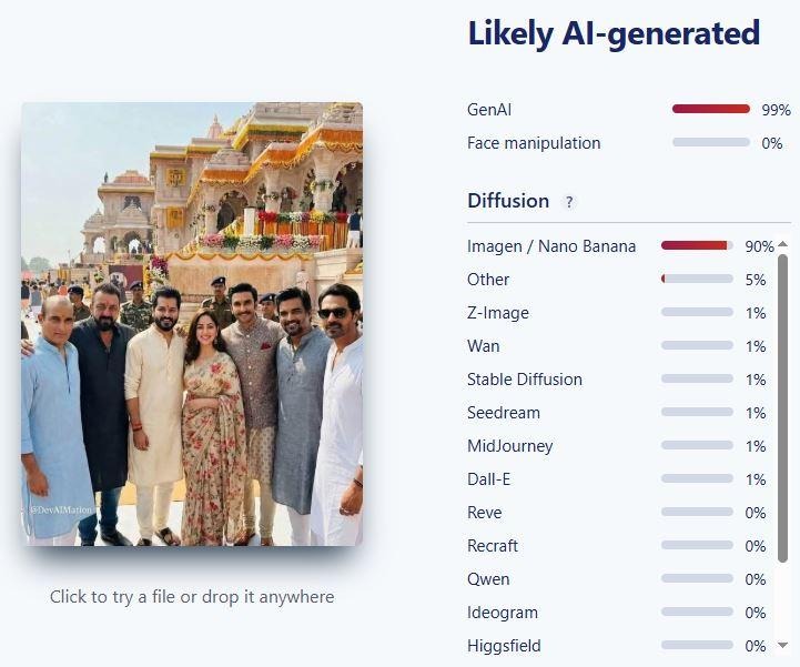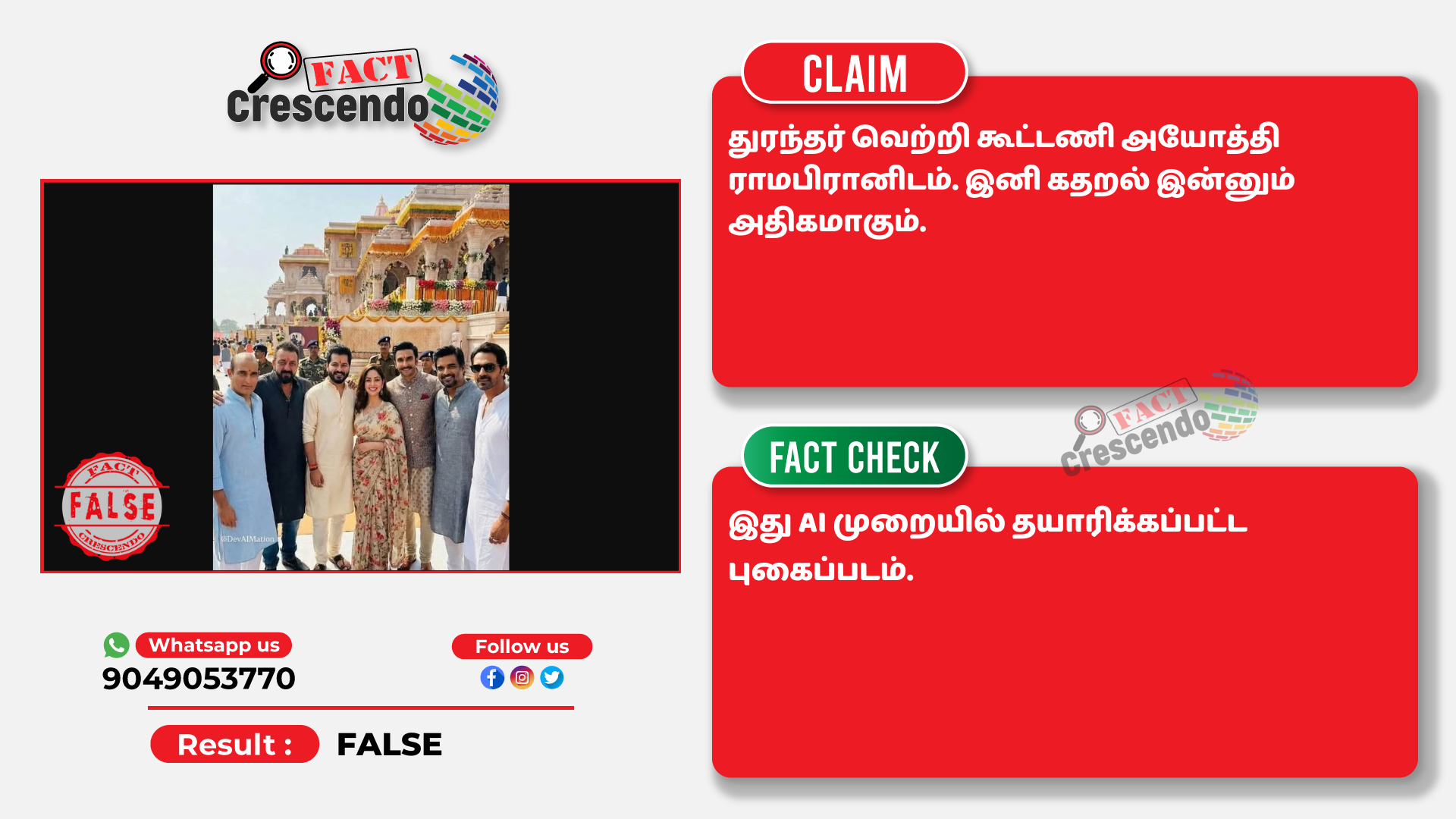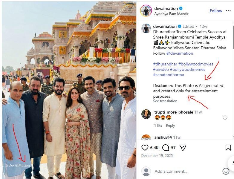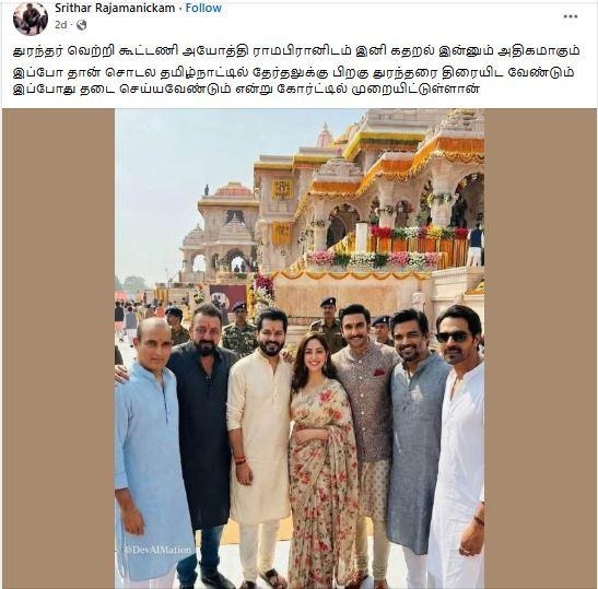 ‘‘துரந்தர் படக்குழு அயோத்தி ராமர் கோயிலுக்குச் சென்றனர்,’’ என்று கூறி, சமூக வலைதளங்களில் பரவும் தகவல் பற்றி ஆய்வு மேற்கொண்டோம்.