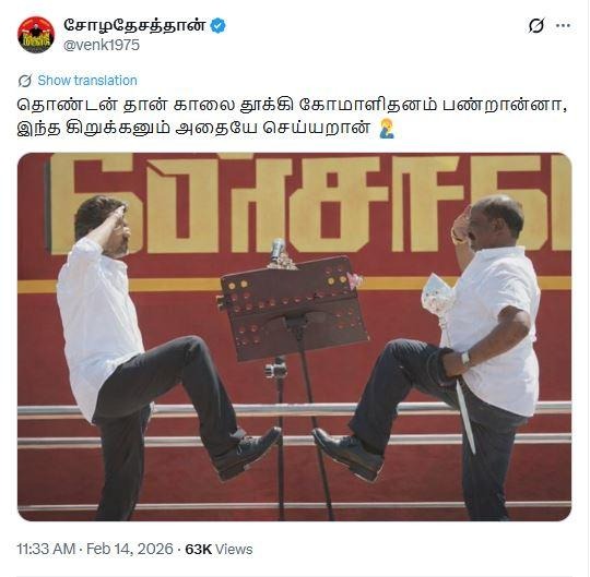 இதில், ‘தொண்டன் தான் காலை தூக்கி கோமாளிதனம் பண்றான்னா, இந்த கிறுக்கனும் அதையே செய்யறான் 🤦♂️’’ என்று எழுதப்பட்டுள்ளது.