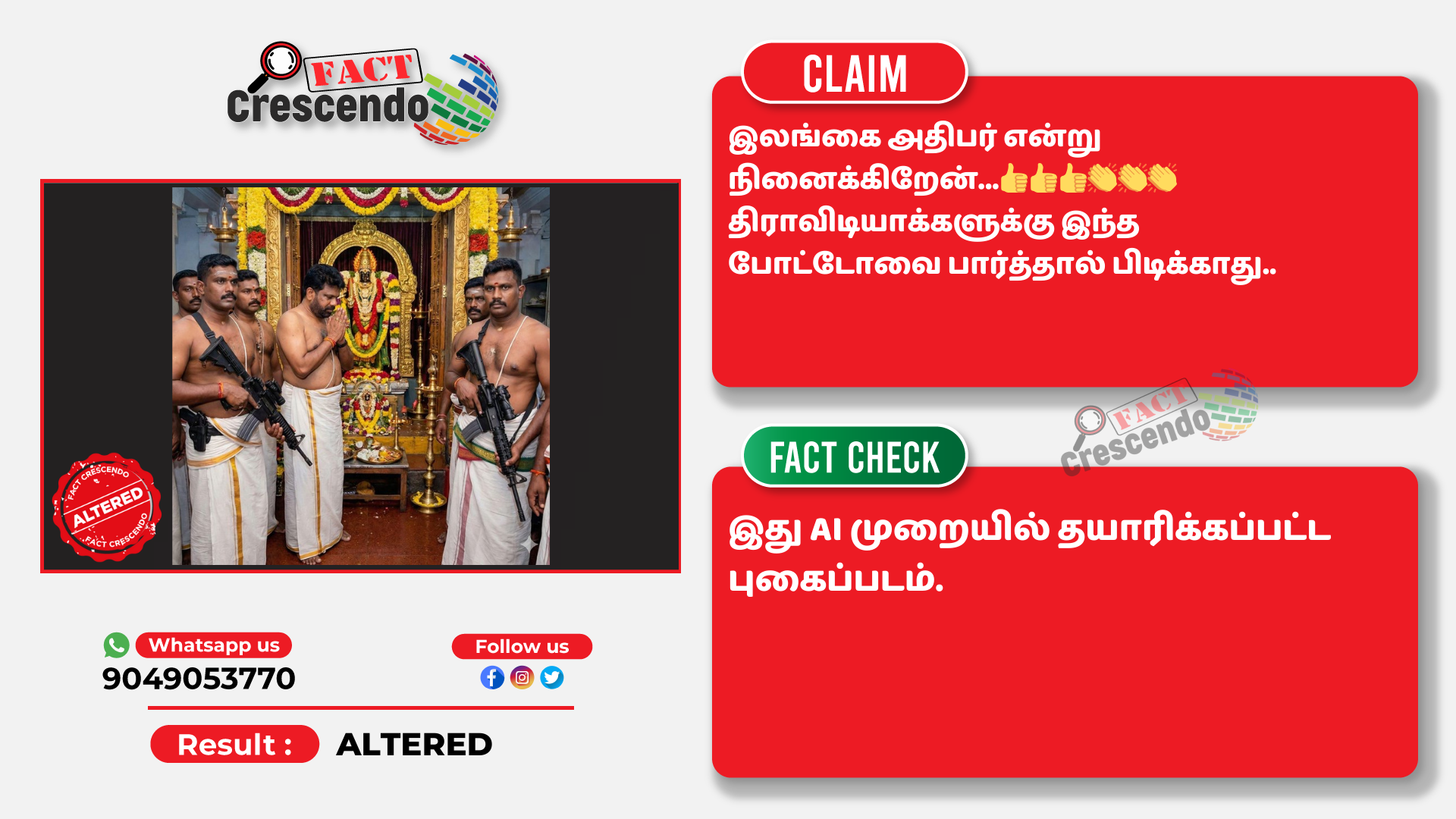 உரிய ஆதாரங்களின் அடிப்படையில் மேற்கண்ட தகவல் நம்பகமானது இல்லை என்று ஃபேக்ட் கிரஸண்டோ தமிழ் நிரூபித்துள்ளது. நமது வாசகர்கள் இத்தகைய தவறான செய்தி, புகைப்படம் மற்றும் வீடியோவை கண்டால், எங்களது வாட்ஸ் ஆப் எண்ணிற்கு (+91 9049053770) அனுப்புங்கள். நாங்கள், அதுபற்றி ஆய்வு செய்து உண்மை விவரத்தை வெளியிடுகிறோம்.