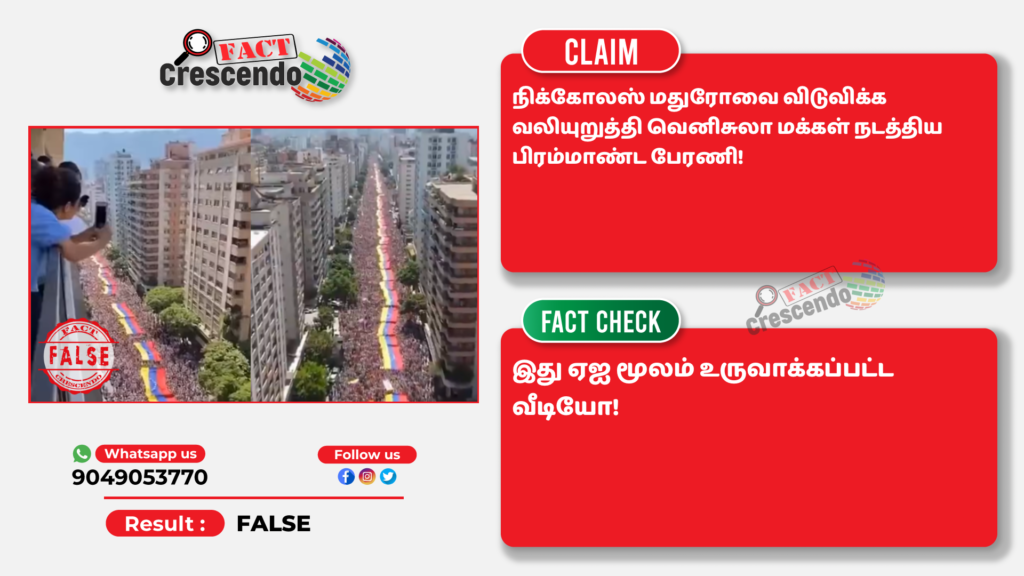 ஏஐ மூலம் உருவாக்கப்பட்ட வீடியோவை நிக்கோலஸ் மதுரோவை விடுவிக்க வலியுறுத்தி பிரம்மாண்ட பேரணி நடத்திய வெனிசுலா மக்கள் என்று தவறாக சமூக ஊடகங்களில் பதிவிட்டுள்ளதை தகுந்த ஆதாரங்கள் அடிப்படையில் ஃபேக்ட் கிரஸண்டோ தமிழ் உறுதி செய்துள்ளது. எனவே, நமது வாசகர்கள், இத்தகைய தவறான செய்தி, புகைப்படங்கள், வீடியோ போன்றவற்றை உறுதி செய்யாமல் மற்றவர்களுக்குப் பகிர வேண்டாம் என கேட்டுக் கொள்கிறோம். வாசகர்கள் தங்களுக்கு சந்தேகம் என்று தோன்றும் தகவல், பதிவு, புகைப்படம், வீடியோவை எங்களது வாட்ஸ் ஆப் எண்ணிற்கு (+91 9049053770) அனுப்பினால், அதுபற்றி ஆய்வு செய்து உண்மை விவரத்தை வெளியிடுகிறோம்.