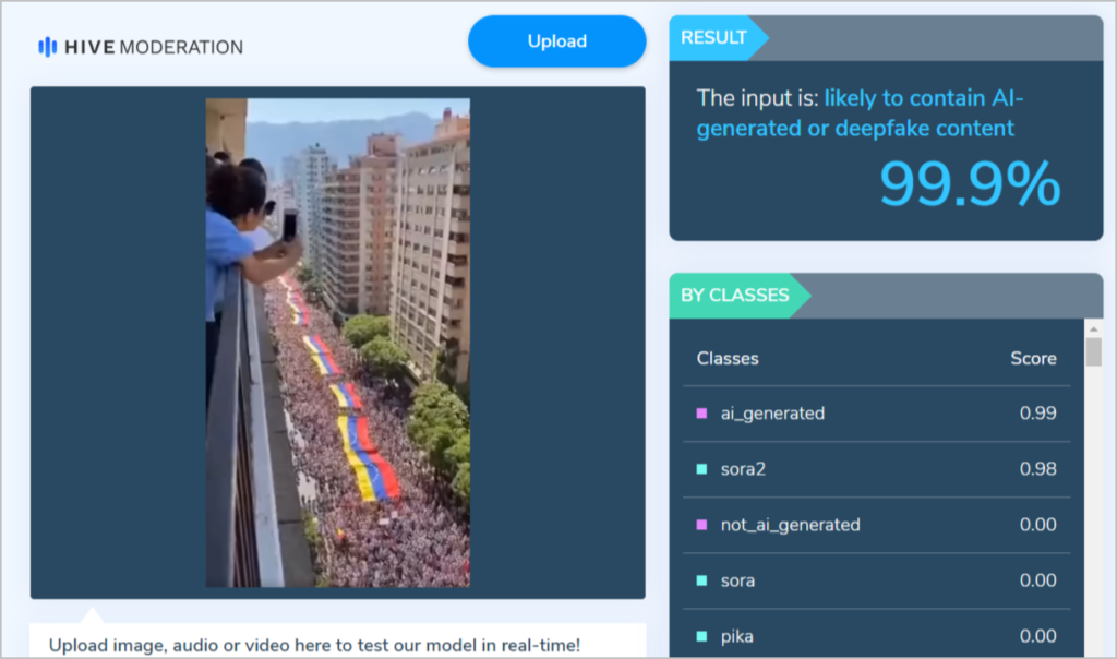 இந்த வீடியோ மட்டுமின்றி இன்னும் ஏராளமான போராட்டங்கள் தொடர்பான வீடியோக்கள் ஏஐ மூலம் உருவாக்கப்பட்டு அந்த டிக்டாக் பக்கத்தில் பதிவேற்றம் செய்யப்பட்டுள்ளதாகவும் தெரியவந்தது. இந்த வீடியோவை ஏஐ கண்டறிய உதவும் இணையதளங்களில் பதிவேற்றித் தேடினோம். அதுவும் கூட இது ஏஐ மூலம் உருவாக்கப்பட்ட வீடியோ என்று கூறியது.