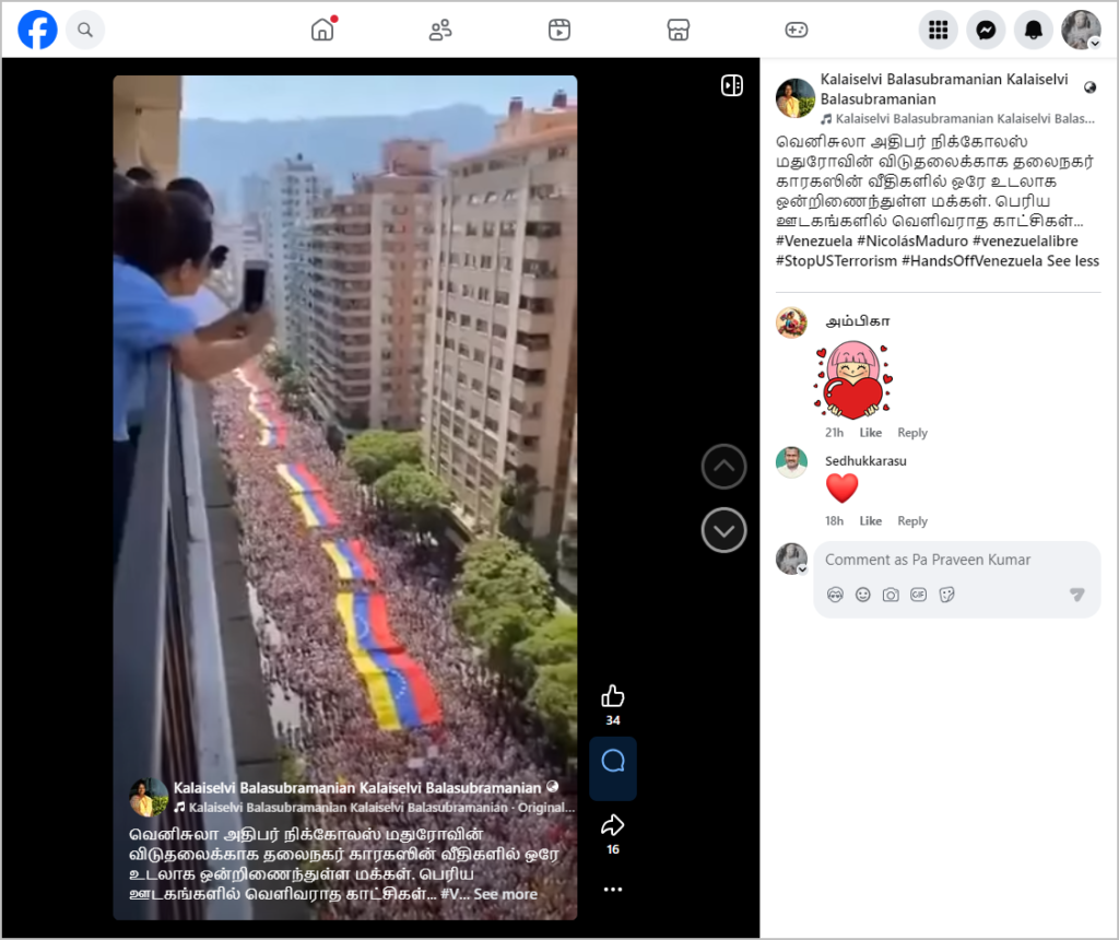 வெனிசுலா நாட்டுக் கொடியுடன் பிரம்மாண்ட பேரணி நடந்தது போன்று வீடியோ ஃபேஸ்புக்கில் பதிவிடப்பட்டுள்ளது. நிலைத் தகவலில், “வெனிசுலா அதிபர் நிக்கோலஸ் மதுரோவின் விடுதலைக்காக தலைநகர் காரகஸின் வீதிகளில் ஒரே உடலாக ஒன்றிணைந்துள்ள மக்கள். பெரிய ஊடகங்களில் வெளிவராத காட்சிகள்…” என்று குறிப்பிடப்பட்டிருந்தது. இந்த வீடியோவை பலரும் சமூக ஊடகங்களில் பதிவிட்டு வருகின்றனர்.
