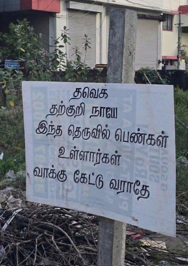 இதில், ‘’தவெக தற்குறி நாயே. இந்த தெருவில் பெண்கள் உள்ளார்கள். வாக்கு கேட்டு வராதே’’ என்று எழுதப்பட்டுள்ளது.