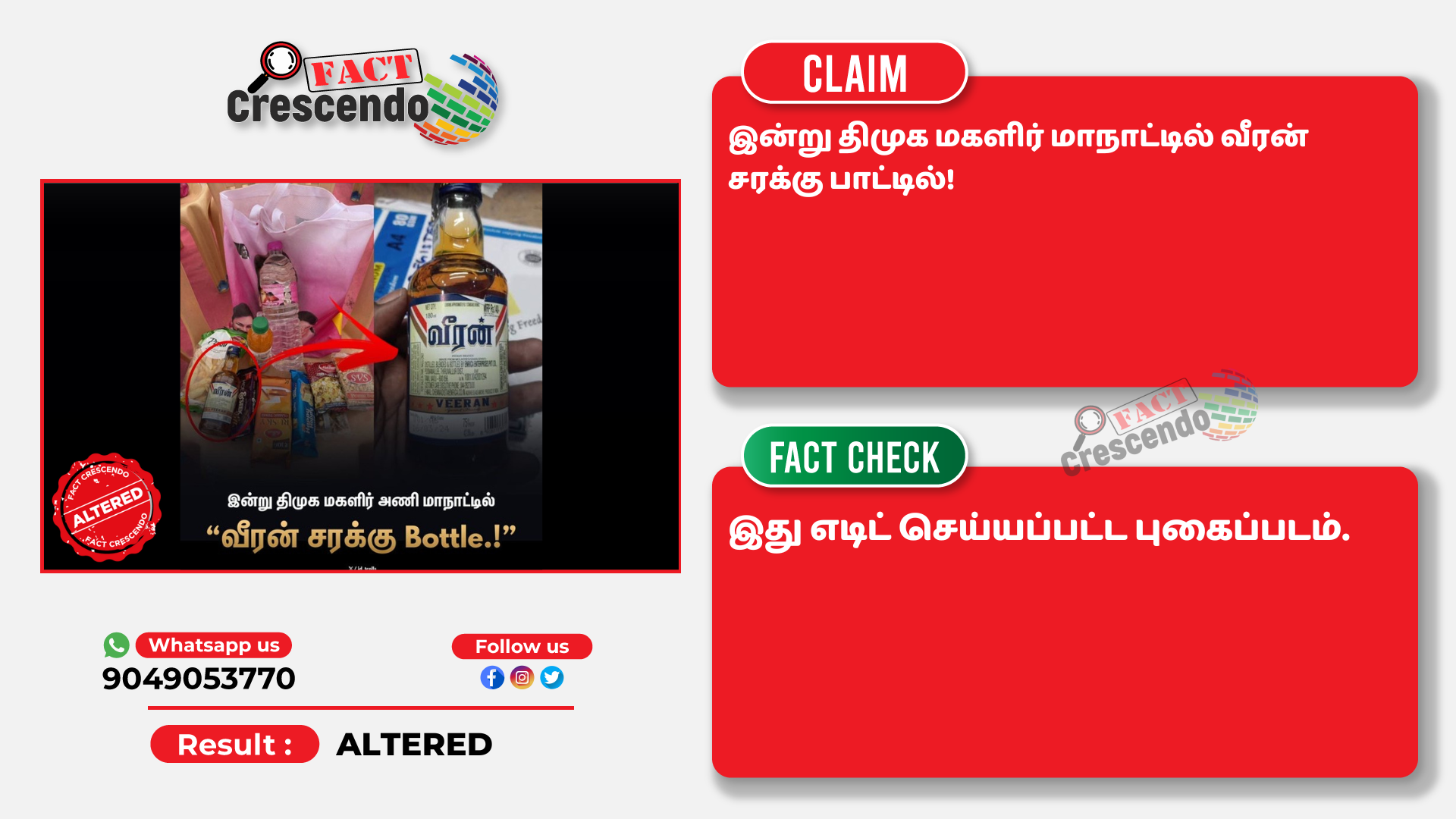 உரிய ஆதாரங்களின் அடிப்படையில் மேற்கண்ட தகவல் நம்பகமானது இல்லை என்று ஃபேக்ட் கிரஸண்டோ தமிழ் நிரூபித்துள்ளது. நமது வாசகர்கள் இத்தகைய தவறான செய்தி, புகைப்படம் மற்றும் வீடியோவை கண்டால், எங்களது வாட்ஸ் ஆப் எண்ணிற்கு (+91 9049053770) அனுப்புங்கள். நாங்கள், அதுபற்றி ஆய்வு செய்து உண்மை விவரத்தை வெளியிடுகிறோம்.