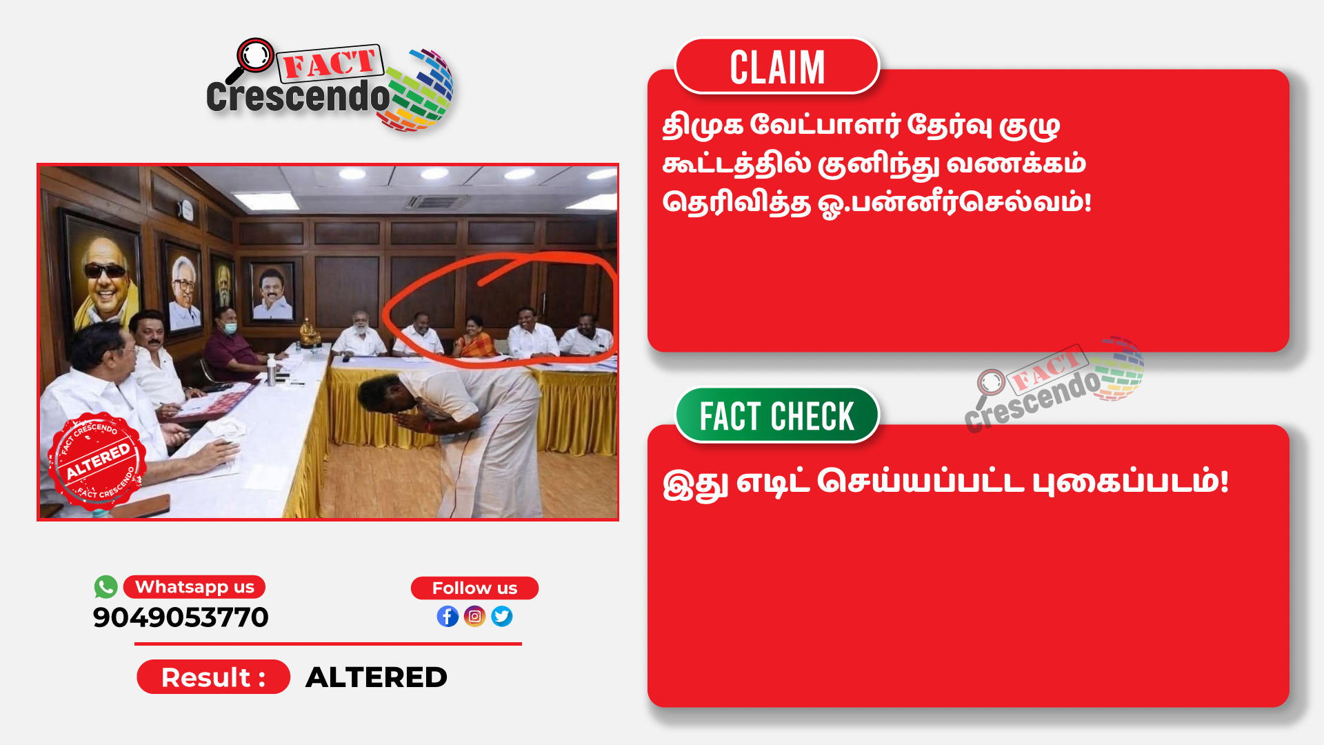 தி.மு.க வேட்பாளர் தேர்வு குழு கூட்டத்தில் பங்கேற்ற ஓ.பன்னீர்செல்வம் என்று பரவும் புகைப்படம் எடிட் செய்யப்பட்டது என்பதை தகுந்த ஆதாரங்கள் அடிப்படையில் ஃபேக்ட் கிரஸண்டோ தமிழ் உறுதி செய்துள்ளது. எனவே, இத்தகைய தவறான செய்தி, புகைப்படங்கள், வீடியோ போன்றவற்றை உறுதி செய்யாமல் மற்றவர்களுக்குப் பகிர வேண்டாம் என கேட்டுக் கொள்கிறோம். வாசகர்கள் தங்களுக்கு சந்தேகம் என்று தோன்றும் தகவல், பதிவு, புகைப்படம், வீடியோவை எங்களது வாட்ஸ் ஆப் எண்ணிற்கு (+91 9049053770) அனுப்பினால், அதுபற்றி ஆய்வு செய்து உண்மை விவரத்தை வெளியிடுகிறோம்.
