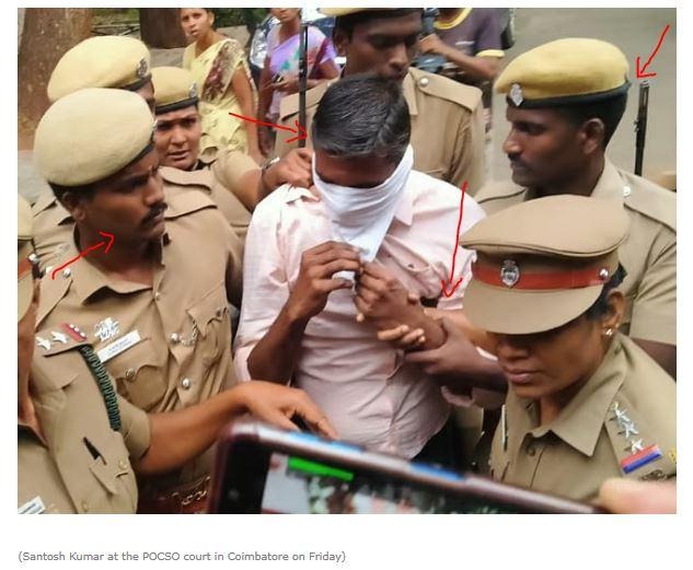 இதன்படி கடந்த 2019ம் ஆண்டு கோவையில் 7 வயது சிறுமியை வன்கொடுமை செய்து, கொன்ற சந்தோஷ்குமார் என்பவருக்கு, தூக்கு தண்டனை விதிக்கப்பட்டது. அதன்போது, சந்தோஷ்குமாரை போலீசார் அழைத்துச் சென்ற புகைப்படம்தான் இது. இதனை எடிட் செய்து, தவறான முகம் சேர்த்து, வதந்தி பரப்புகிறார்கள்.