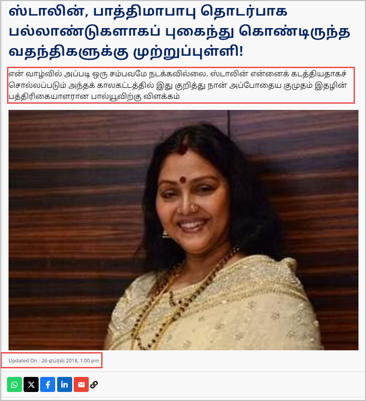 முதலமைச்சர் மு.க.ஸ்டாலினுடன் டி.வி செய்தி வாசிப்பாளராக இருந்து நடிகையாக மாறிய பாத்திமா பாபுவை இணைத்து 35-40 ஆண்டுகளுக்கும் மேலாக வதந்தி பரப்பப்பட்டு வருகிறது. இது பற்றி இருவருமே விளக்கம் அளித்துவிட்டனர். என்னைப் பற்றி நான் சொல்வதுதான் உண்மை என்று பாத்திமா பாபு காட்டமாகவே பதில் அளித்துவிட்டார். ஆனாலும், அதை நாங்கள் நம்பமாட்டோம் என்று விஷமிகள் தொடர்ந்த வதந்தி பரப்பி வருகின்றனர். இது தொடர்பாக நம்முடைய ஃபேக்ட் கிரஸண்டோவில் 2019ம் ஆண்டே கட்டுரை வெளியிட்டிருந்தோம்.