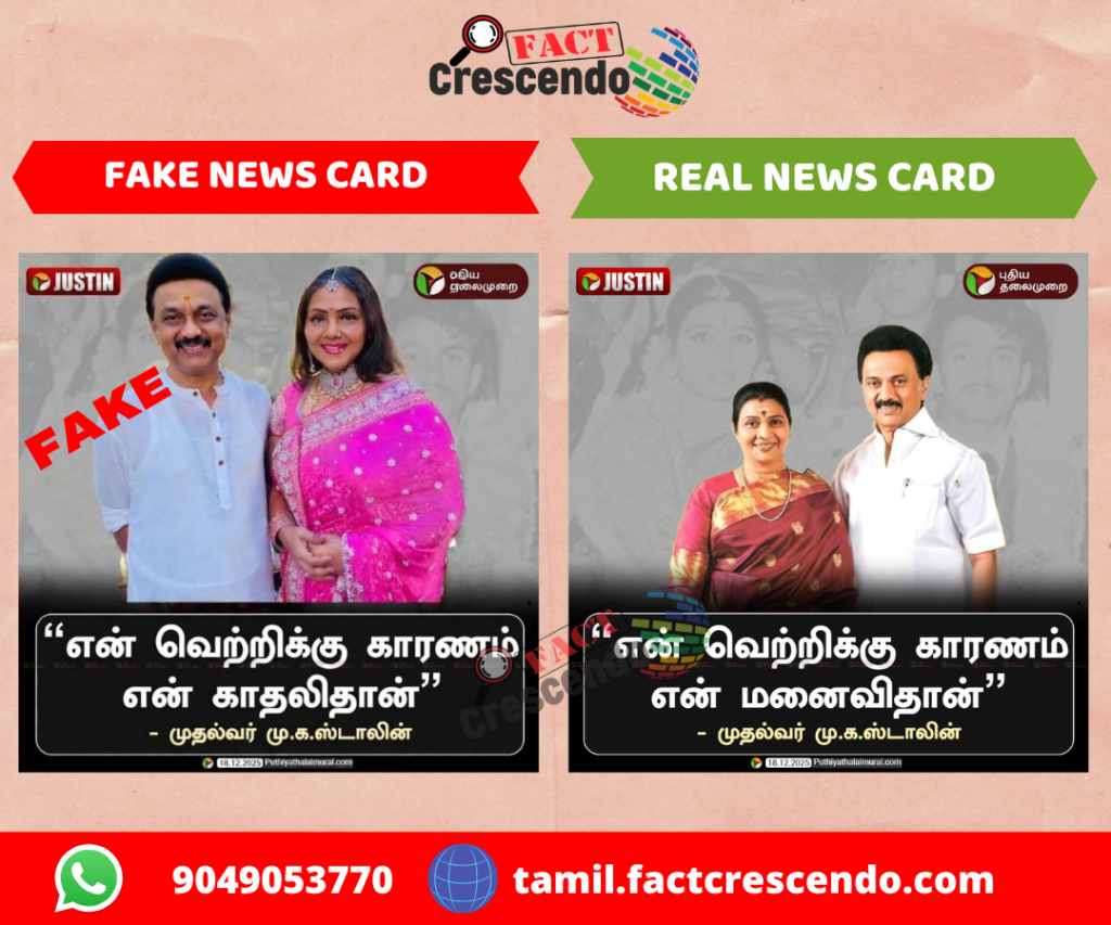 இப்படி ஒரு நியூஸ் கார்டை புதிய தலைமுறை வெளியிட்டிருந்ததா என்று தேடிப் பார்த்தோம். அப்போது, 2025 டிசம்பரில் “என் வெற்றிக்கு காரணம் என் மனைவிதான் – முதல்வர் மு.க.ஸ்டாலின்” என்று குறிப்பிட்டு நியூஸ் கார்டை வெளியிட்டிருந்தது தெரிந்தது. அந்த நியூஸ் கார்டை எடிட் செய்து தவறாகப் பதிவிட்டிருப்பது உறுதியானது.