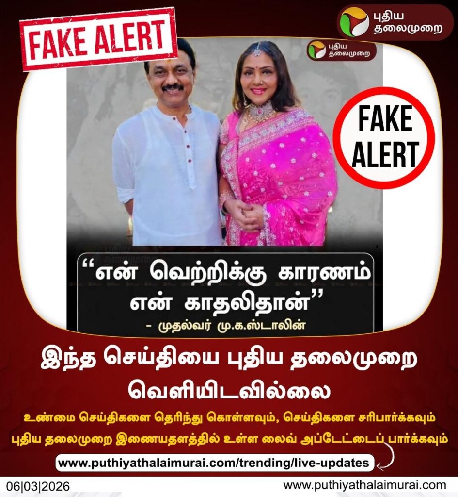 புதிய தலைமுறை வெளியிட்டது போன்று மு.க.ஸ்டாலின் – பாத்திமா பாபு ஒன்றாக இருப்பது போன்ற புகைப்படத்துடன் நியூஸ் கார்டு ஒன்று சமூக ஊடகங்களில் பகிரப்பட்டு வருகிறது. அதில், “என் வெற்றிக்கு காரணம் என் காதலிதான் – முதல்வர் மு.க.ஸ்டாலின்” என்று குறிப்பிடப்பட்டிருந்தது. இந்த நியூஸ் கார்டை பலரும் சமூக ஊடகங்களில் பதிவிட்டு வருகின்றனர்.