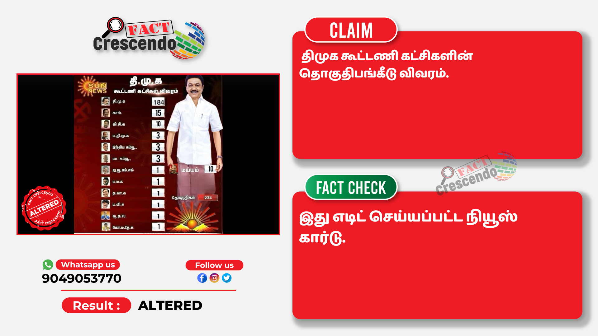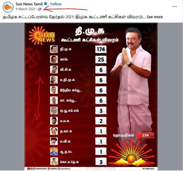 ஆம், கடந்த 2021ம் ஆண்டு சட்டமன்ற தேர்தலை முன்னிட்டு, தி.மு.க கூட்டணியில் உள்ள கட்சிகளுக்கு ஒதுக்கப்பட்ட தொகுதிகள் பற்றி, சன் நியூஸ் ஒரு செய்தி வெளியிட்டது. அதனை எடுத்து, எடிட் செய்து, 2026ம் ஆண்டு தேர்தலுக்கான தி.மு.க தொகுதி பங்கீடு என்று கூறி, தவறான தகவல் பரப்புகிறார்கள்.