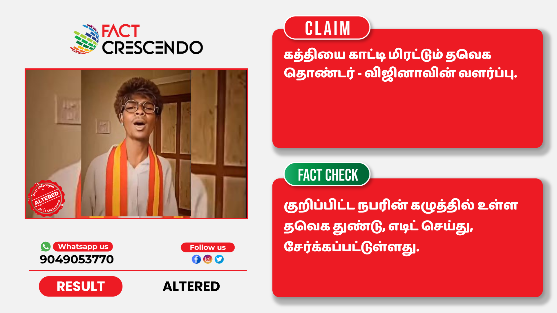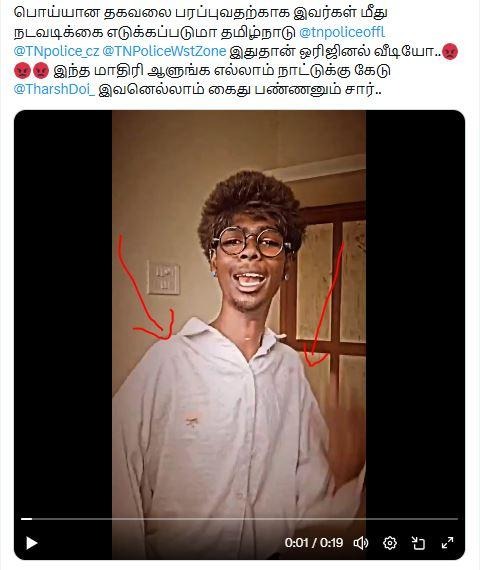 மேற்கண்ட தகவல் உண்மையா என்று நாம் ஆய்வு மேற்கொண்டோம். அப்போது, இந்த வீடியோவில் வரும் நபரின் கழுத்தில் உள்ள துண்டு, எடிட் முறையில் சேர்க்கப்பட்ட ஒன்று, என்பது தெரியவந்தது.