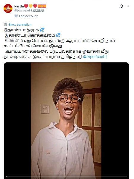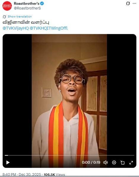 இதில், ‘’விஜினாவின் வளர்ப்பு’’ என்று எழுதப்பட்டுள்ளது. இதனுடன், கழுத்தில் தவெக துண்டு அணிந்த இளைஞர் ஒருவர் கத்தியை காட்டி, மிரட்டுவது போன்ற காட்சிகள் கொண்ட வீடியோ இணைக்கப்பட்டுள்ளது.