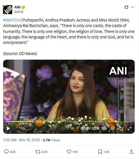 இதன்படி, கடந்த நவம்பர் 19, 2026 அன்று ஆந்திரப் பிரதேசத்தின் புட்டபர்த்தியில் சத்ய சாய் பாபாவின் பிறந்தநாள் நூற்றாண்டு விழா நடைபெற்றது. இதில், பிரதமர் மோடி மற்றும் சச்சின் டெண்டுல்கர், நடிகை ஐஸ்வர்யா ராய் ஆகியோர் சிறப்பு விருந்தினர்களாக பங்கேற்றனர்.