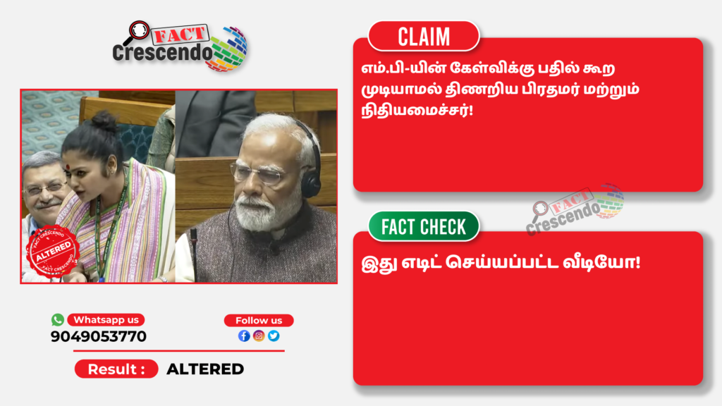 எம்.பி-யின் கேள்விக்கு பதில் கூற முடியாமல் திணறிய பிரதமர் மற்றும் நிதியமைச்சர் என்று பரவும் வீடியோ எடிட் செய்யப்பட்டது என்பதை தகுந்த ஆதாரங்கள் அடிப்படையில் ஃபேக்ட் கிரஸண்டோ தமிழ் உறுதி செய்துள்ளது. எனவே, இத்தகைய தவறான செய்தி, புகைப்படங்கள், வீடியோ போன்றவற்றை உறுதி செய்யாமல் மற்றவர்களுக்குப் பகிர வேண்டாம் என கேட்டுக் கொள்கிறோம். வாசகர்கள் தங்களுக்கு சந்தேகம் என்று தோன்றும் தகவல், பதிவு, புகைப்படம், வீடியோவை எங்களது வாட்ஸ் ஆப் எண்ணிற்கு (+91 9049053770) அனுப்பினால், அதுபற்றி ஆய்வு செய்து உண்மை விவரத்தை வெளியிடுகிறோம்.