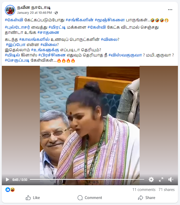எம்.பி ஒருவர் பேச பேச பிரதமர் நரேந்திர மோடி, உத்தரப்பிரதேச முதல்வர் யோகி ஆதித்யநாத், நிதியமைச்சர் நிர்மலா சீதாராமன் ஆகியோர் பதில் கூற முடியாமல் திணறியபடி அவரை பார்ப்பது போன்று ஒரு வீடியோ ஃபேஸ்புக்கில் பதிவிடப்பட்டுள்ளது. நிலைத் தகவலில், “கேள்வி கேட்கப்படும்போது #சங்கீகளின் #மூஞ்சிகளை பாருங்கள்…🤣🤣🤣🤭 #புல்டோசர் வைத்து #மிரட்டி மக்களை #கேள்வி கேட்க விடாமல் செஞ்சது தாண்டா உங்க #சாதனை. கடந்த #காலங்களில் உணவுப் பொருட்களின் #விலை? #இப்போ என்ன #விலை? இதெல்லாம் #உங்களுக்கு எப்படிடா தெரியும்? #மிடில் கிளாஸ் #பிரச்சினை எதுவும் தெரியாத நீ #விஸ்வகுருவா ? மயி..குருவா ? #செருப்படி கேள்விகள்” என்று குறிப்பிடப்பட்டிருந்தது. இந்த வீடியோவை பலரும் சமூக ஊடகங்களில் பதிவிட்டு வருகின்றனர்.