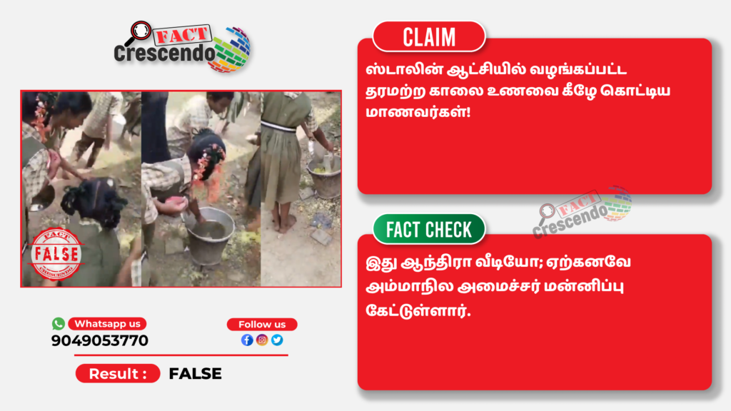 ஆந்திர அரசு பள்ளிக்கூடம் ஒன்றில் தரமற்ற மதிய உணவு வழங்கப்பட்டதாக கூறி அதை மாணவர்கள் கீழே கொட்டிய வீடியோவை தமிழ்நாட்டில் ஸ்டாலின் அரசு வழங்கிய காலை உணவு என்று தவறாக சமூக ஊடகங்களில் பகிர்ந்திருப்பதை தகுந்த ஆதாரங்கள் அடிப்படையில் ஃபேக்ட் கிரஸண்டோ தமிழ் உறுதி செய்துள்ளது. எனவே, இத்தகைய தவறான செய்தி, புகைப்படங்கள், வீடியோ போன்றவற்றை உறுதி செய்யாமல் மற்றவர்களுக்குப் பகிர வேண்டாம் என கேட்டுக் கொள்கிறோம். வாசகர்கள் தங்களுக்கு சந்தேகம் என்று தோன்றும் தகவல், பதிவு, புகைப்படம், வீடியோவை எங்களது வாட்ஸ் ஆப் எண்ணிற்கு (+91 9049053770) அனுப்பினால், அதுபற்றி ஆய்வு செய்து உண்மை விவரத்தை வெளியிடுகிறோம்.