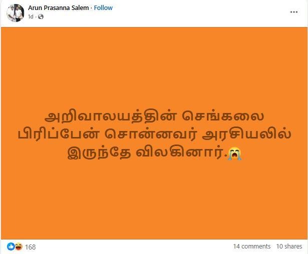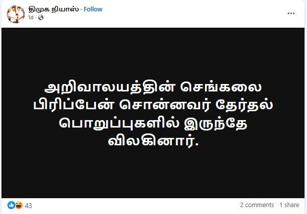 இதில், ‘’ அறிவாலயத்தின் செங்கலை பிரிப்பேன் என்று சொன்னவர் தேர்தல் பொறுப்புகளில் இருந்தே விலகினார்.’’ என்று எழுதப்பட்டுள்ளது.